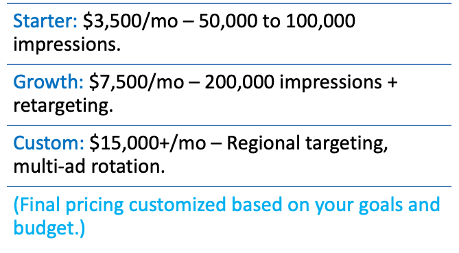 Even with minimal budgets we can make your Creative Media and place it on Hulu, HBO Now, Disney, ESPN, CBS/Paramount, and more, including YouTube and TikTok. Packages for every budget.